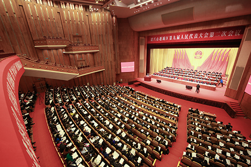 18日上午,越城区九届人大二次会议举行第二次全体会议,区领导徐良平、章烽、金晓明、金百富、徐荻、盛学东、鲍永强、周春雨等在主席台前排就坐。