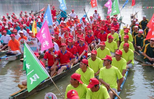 在岸上观看的观众摇旗呐喊,为参赛队员们加油助威。龙舟上的口号声和岸上的加油声融成一片,把龙舟比赛推向了高潮。震耳欲聋的锣鼓声、呐喊声,与岸上欢乐的人群相映成趣,构成一幅弘扬传统民族文化、展示了人与自然和谐的端午民俗风景画。