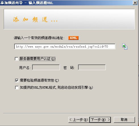 例如:在“RSS 链接地址”输入框中输入 http://www.ghzsbj.com/module/rss/rssfeed.jsp?colid=70,并点击“下一步”按钮。